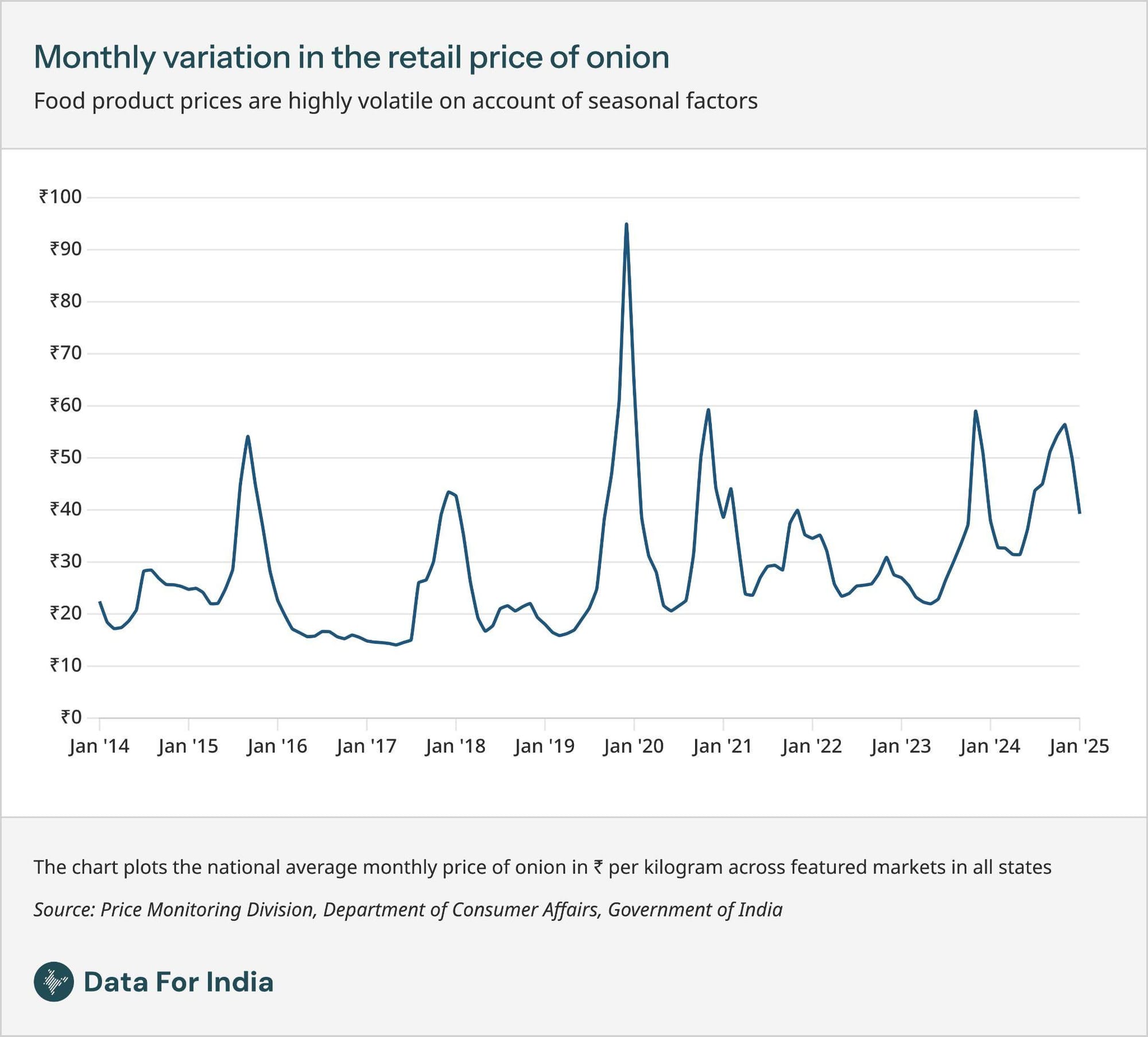 Even though India's overall inflation is low and stable, the prices of specific goods - in particular, food items - sometimes see sudden spikes, typically as a result of weather-related disruptions.