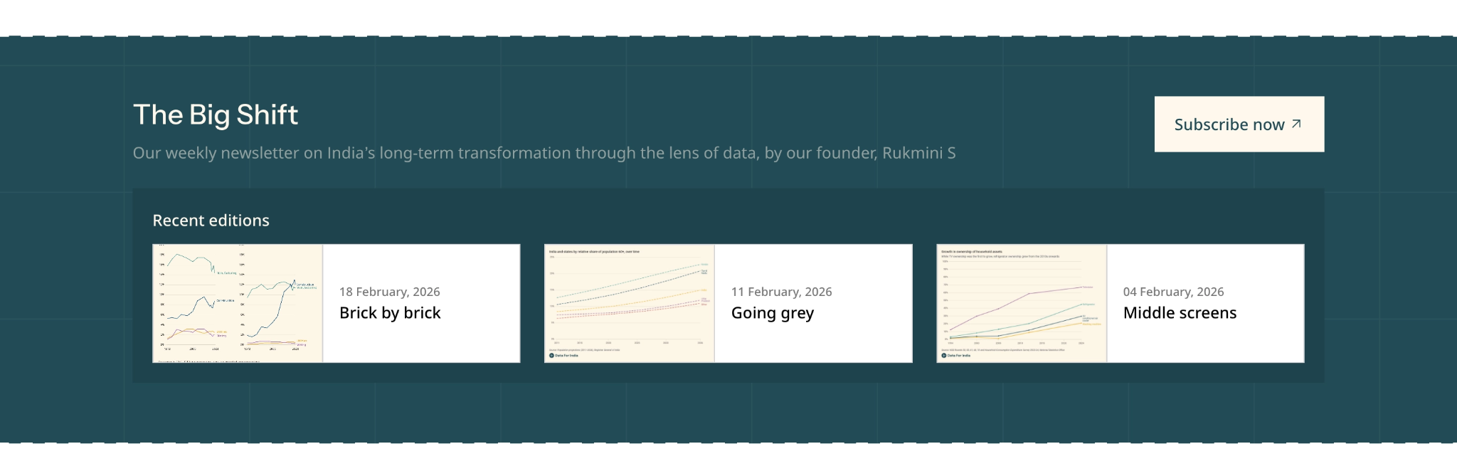 In November 2024, we introduced "The Big Shift" - our weekly subscriber-only newsletter on India's long-term transformation through the lens of data, written by our founder, Rukmini S.