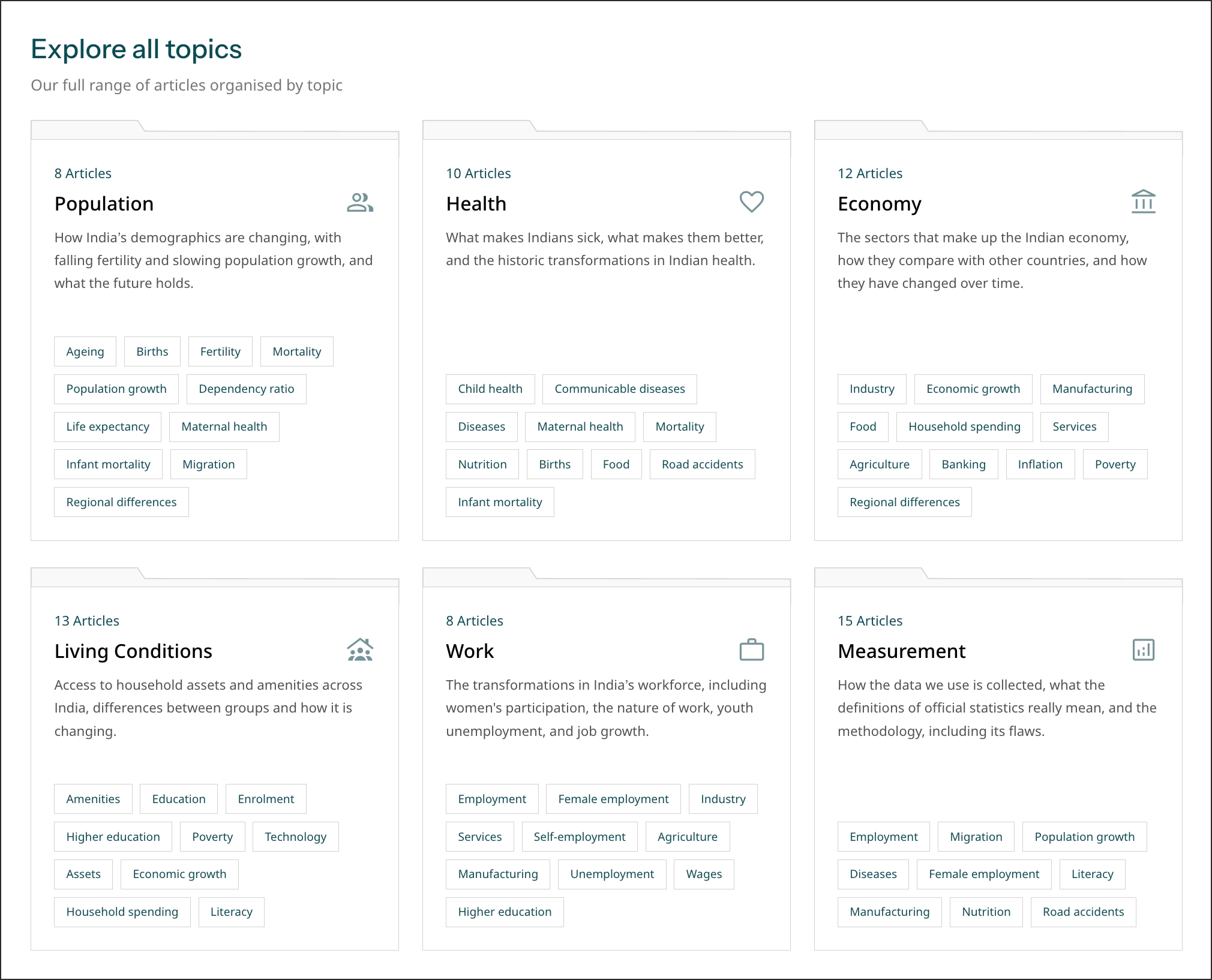 Enhanced topic structure: We have reorganised our work into comprehensive themes and topics. Each piece on the platform now shows the topics covered under it as tags, and each topic page can be easily explored to find related pieces.