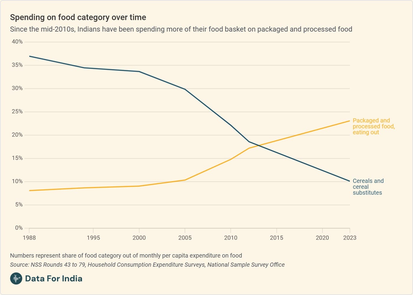 Across the world, people have to spend less of their consumption basket on food as they get richer - they're eating more and spending more on food, but they're also making more money, and more able to spend it on things other than food too. Urban India saw this shift happen by the late 1990s, as spending on fuel and rent in particular, but also durable goods, medical expenses, education and commuting grew.