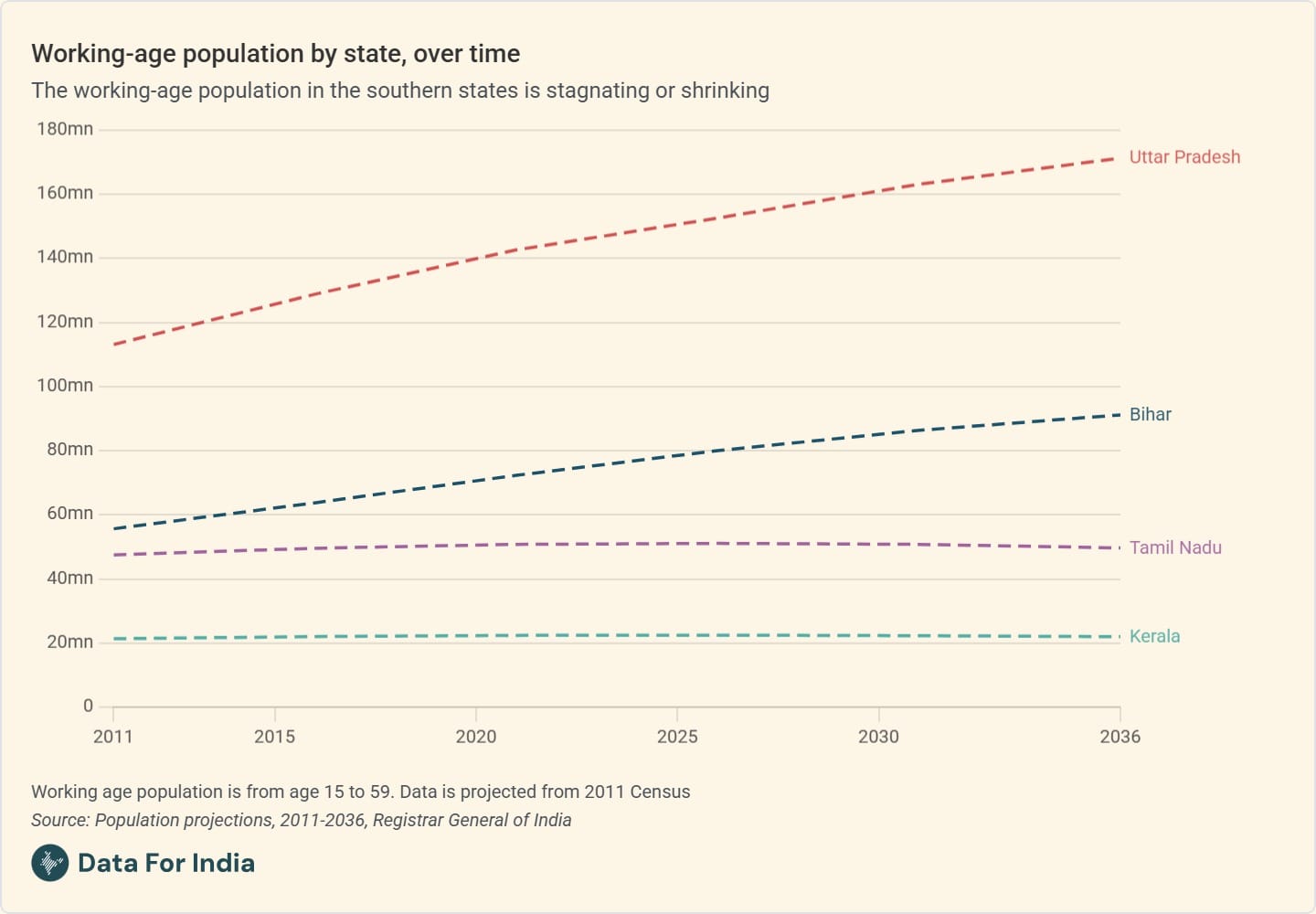 The median Tamil person is already more than twelve years older than the median person from Bihar, and the gap is only projected to grow.