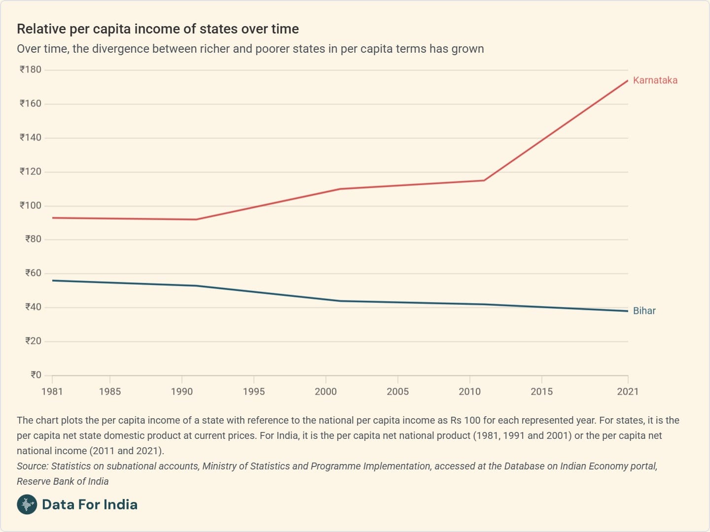 Here again, Abhishek constructs a unique time series. If you held India's per capita income to be Rs 100 for each of the last forty years, Karnataka started a little below the national average in relative terms in 1981, and Bihar significantly below. In the forty years since, Karnataka's per capita income has doubled relative to the national average, while Bihar's has fallen further.