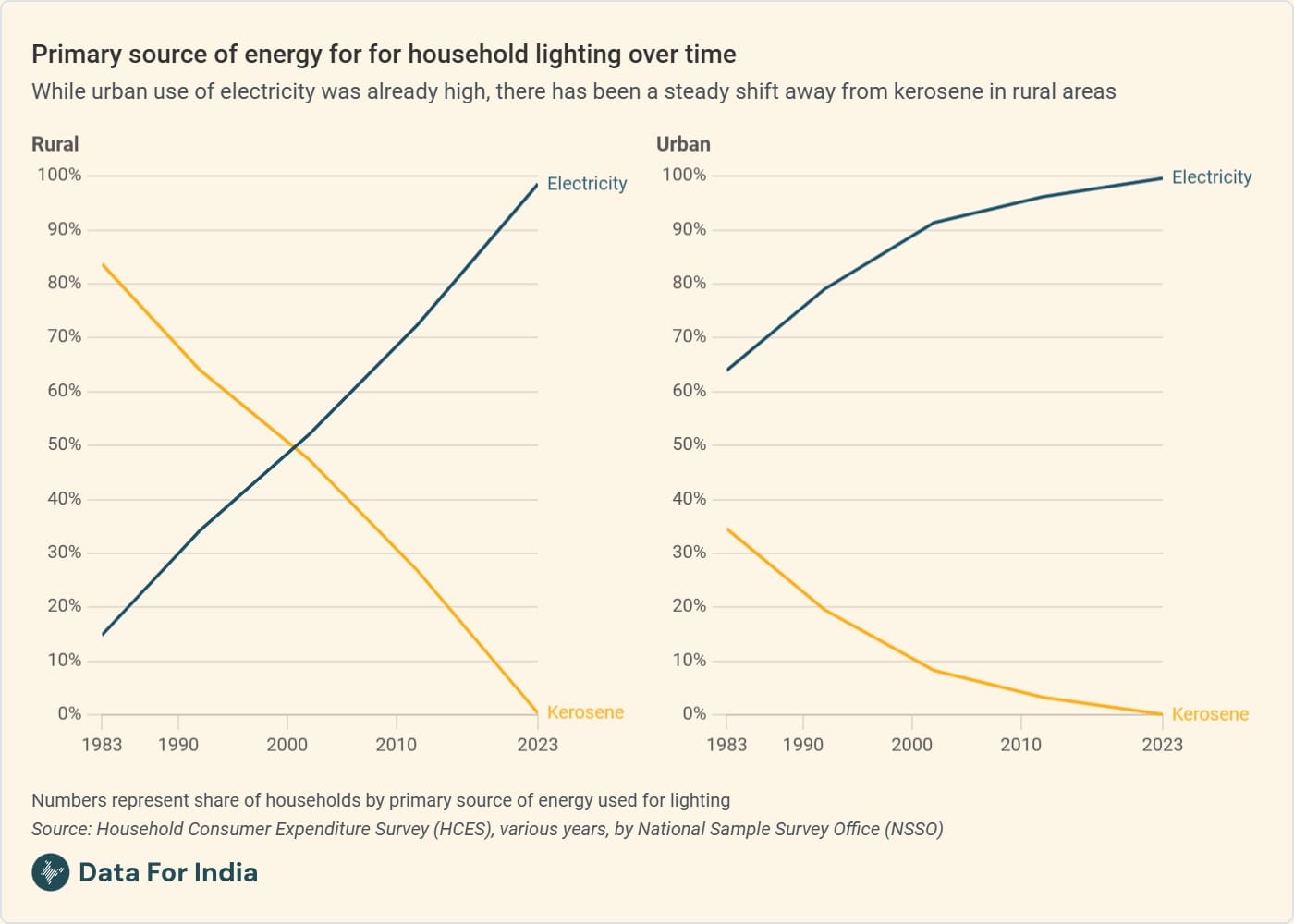 Now on to the big shift. Forty years ago, when Kapil Dev's Indian team won the men's cricket World Cup, more than eight in ten rural households used kerosene to light their homes. That share is now down to virtually zero. Electricity is what lights most Indian homes now - it's what people themselves say. This is a transformative change not just for the country's economy, but also because we have some evidence from a systematic review of the positive effects of electricity on household socioeconomic outcomes including on education and health. And it's happened within half a lifetime